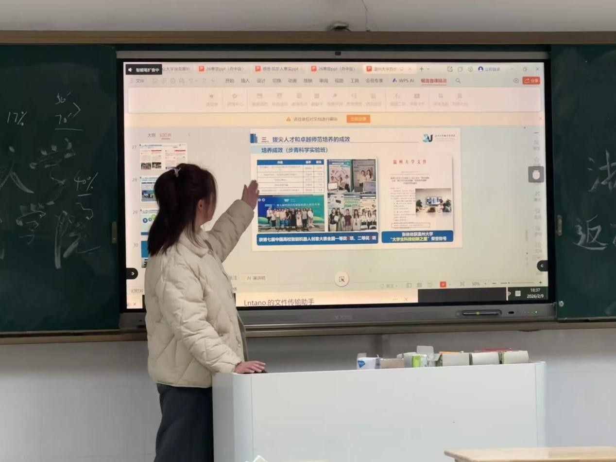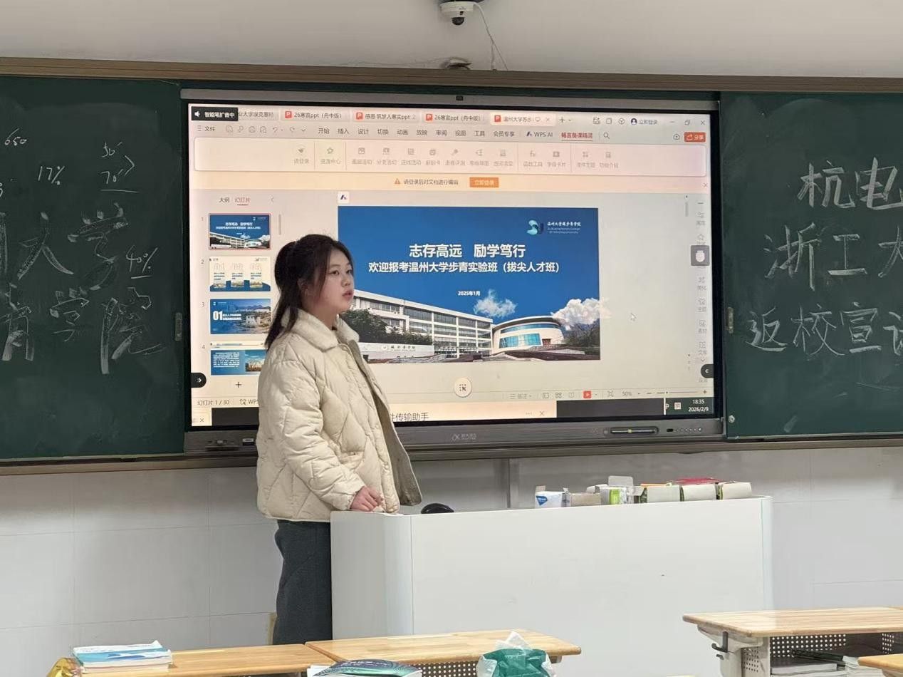 这次返校宣讲,表面上是我在介绍温州大学苏步青学院,实质上是在山海之间架起了一座教育的桥梁。我从舟山带去了海的气息,从温州带回了山的厚重。更珍贵的是,我完成了一次身份的转变与传承——从被引导者成长为引导者,从接受知识的学生转变为分享经验的学姐。